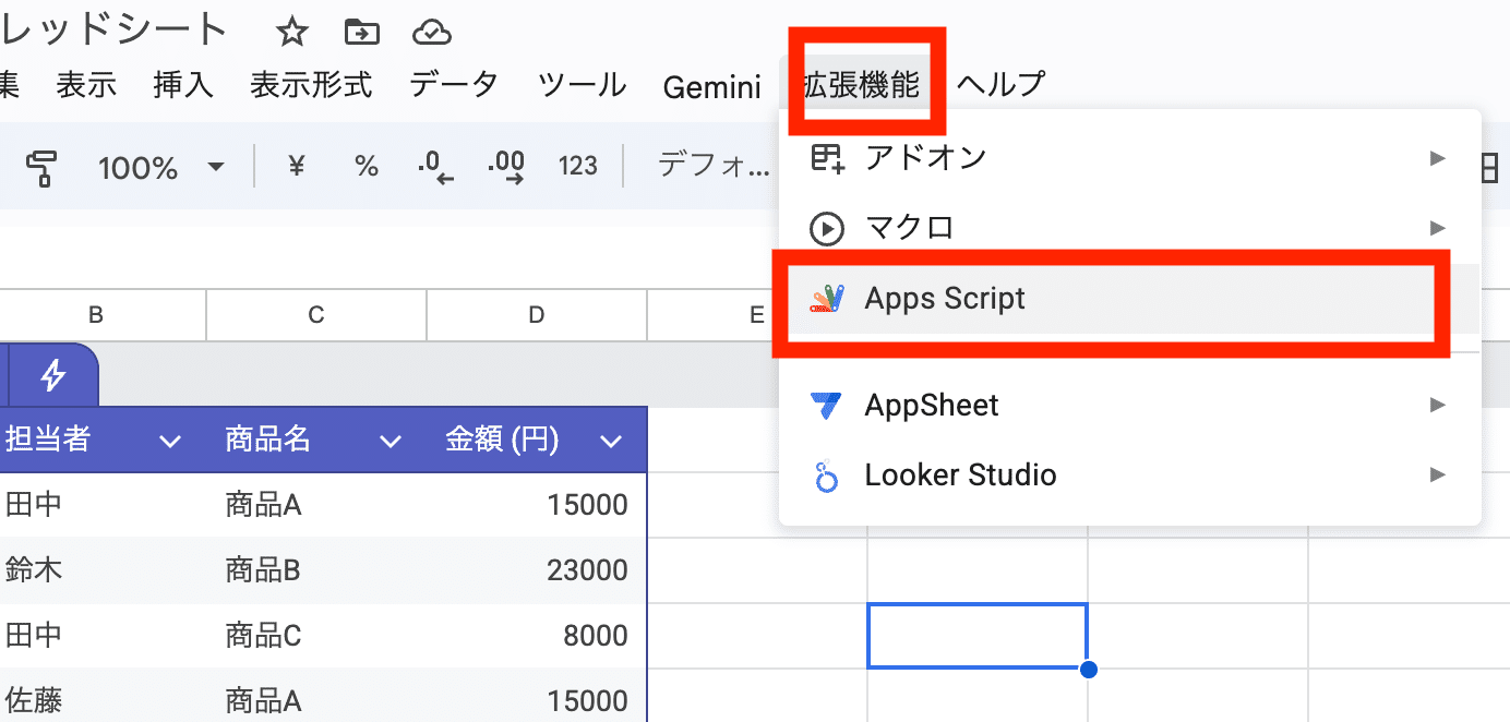 スプレッドシートのメニューから「拡張機能」→「Apps Script」をクリックします。