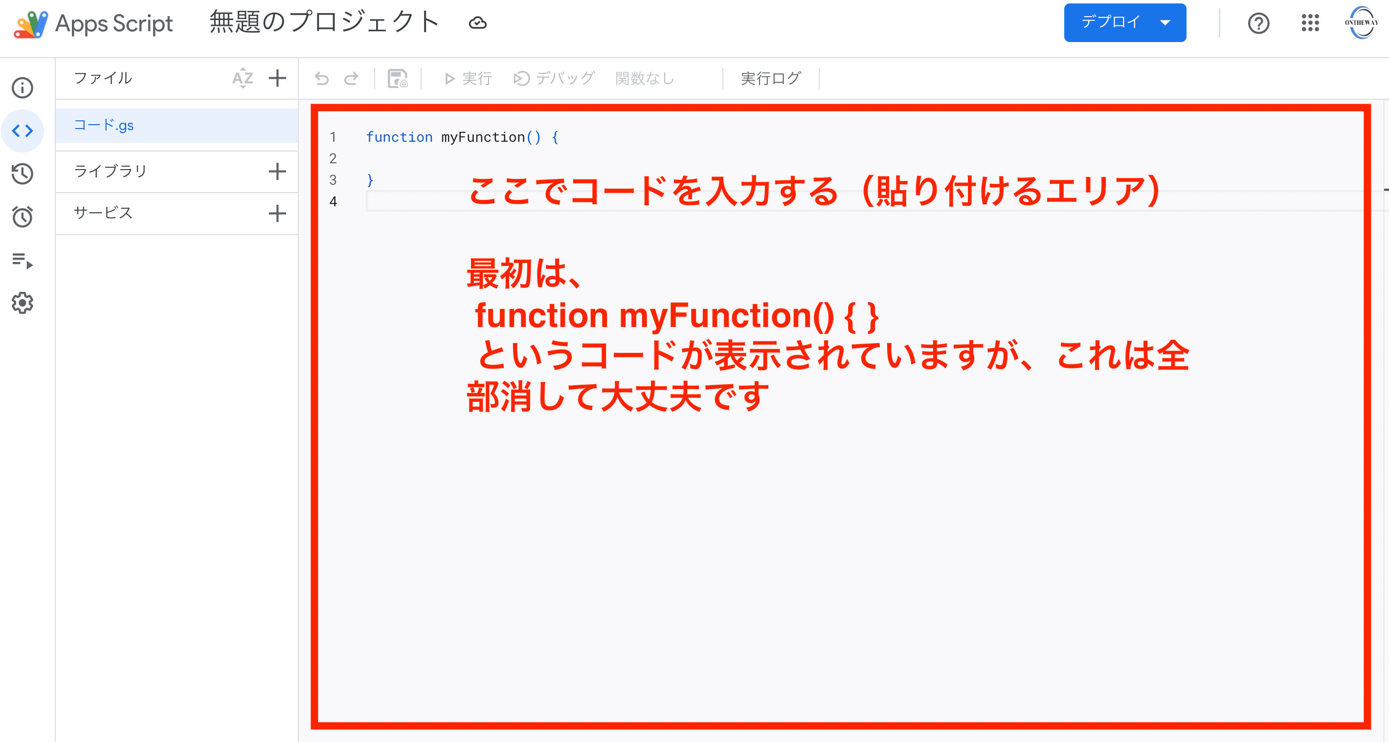 新しいタブでGASのエディタが開きます。最初から function myFunction() { } というコードが表示されていますが、これは全部消して大丈夫です。
