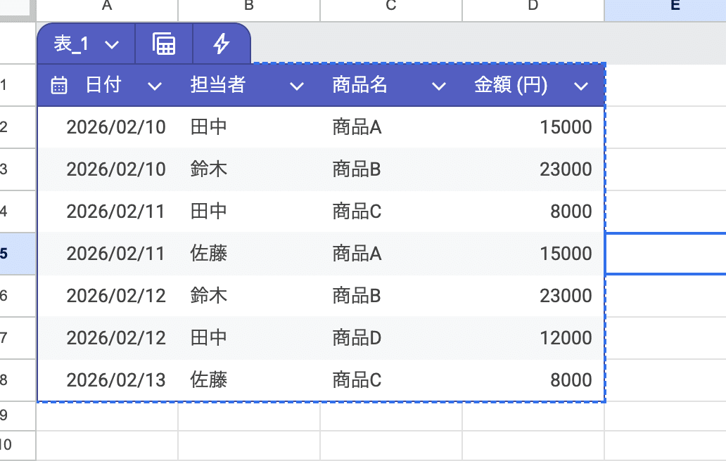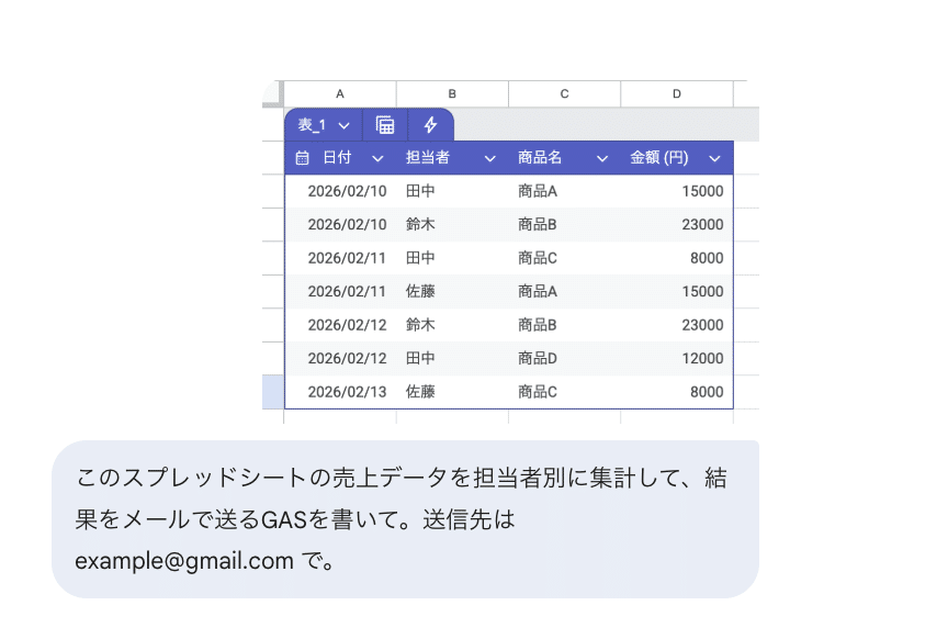 数行で構いません。ここでのポイントは、1行目を必ず見出し行にすることです。「日付」「担当者」「商品名」「金額」という見出しがあることで、GASがデータの構造を正しく認識できます。