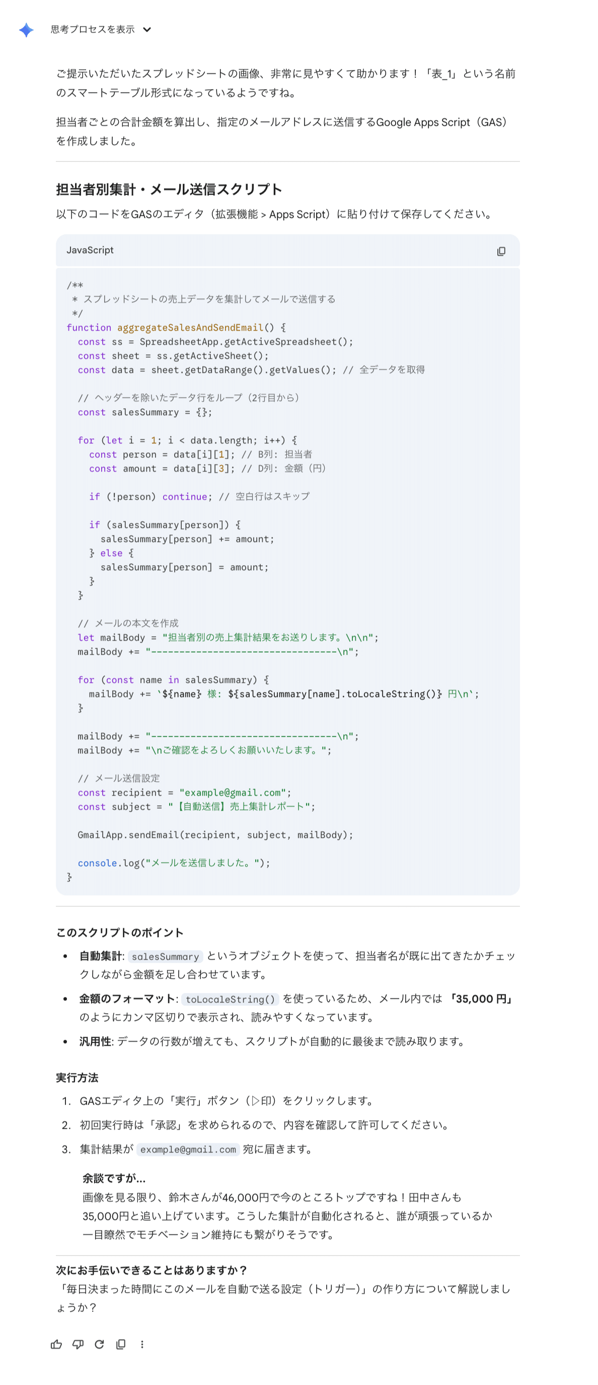 「集計結果に日付の範囲も入れてほしい」 「メールの件名を『週次売上レポート』にして」 「金額にカンマ区切りを入れて見やすくして」