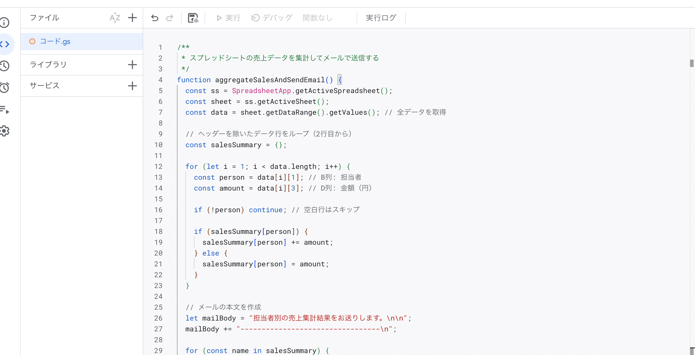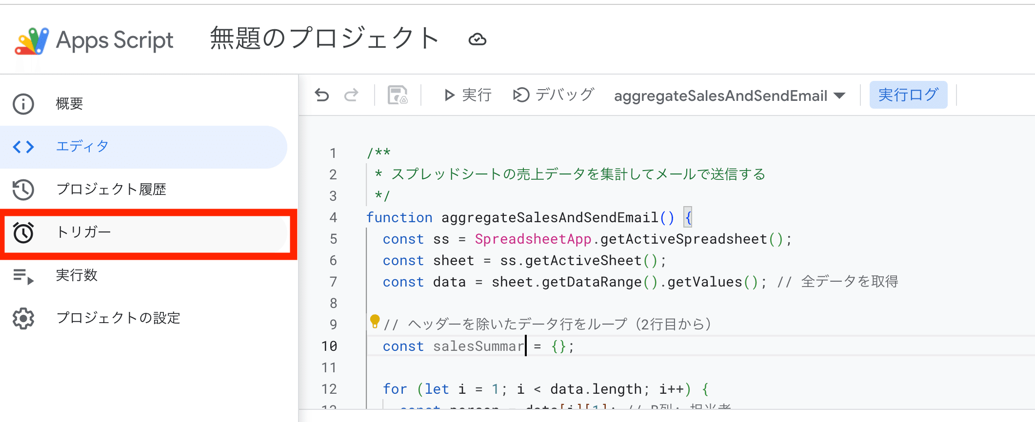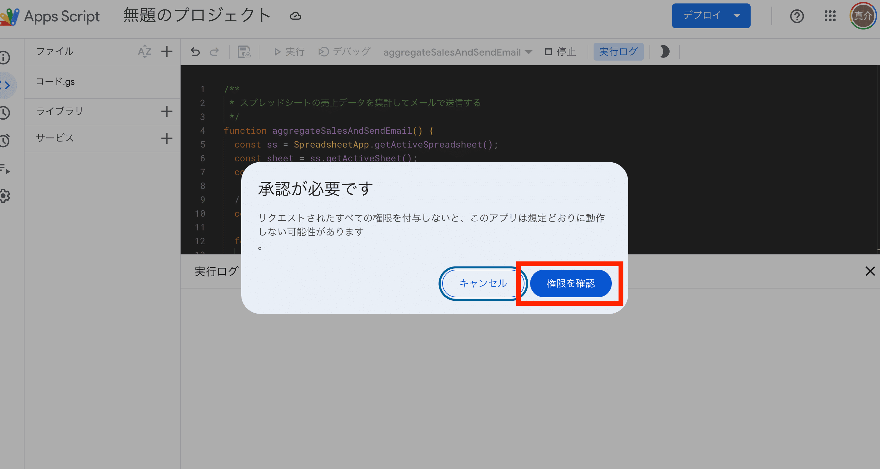 次に、実行する関数を選択します。エディタ上部のドロップダウンから、AIが作ってくれたメイン関数(例えば sendSalesReport など)を選び、「▶ 実行」ボタンをクリックします。