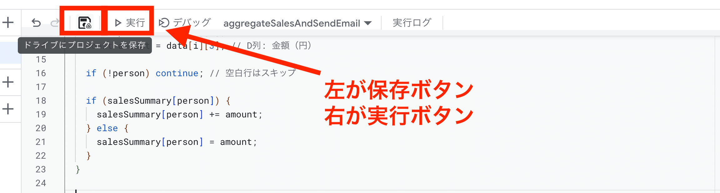エディタ上部のフロッピーディスクアイコン(💾)をクリックして保存します。プロジェクト名を聞かれたら、「売上集計」など適当な名前を付けてください。