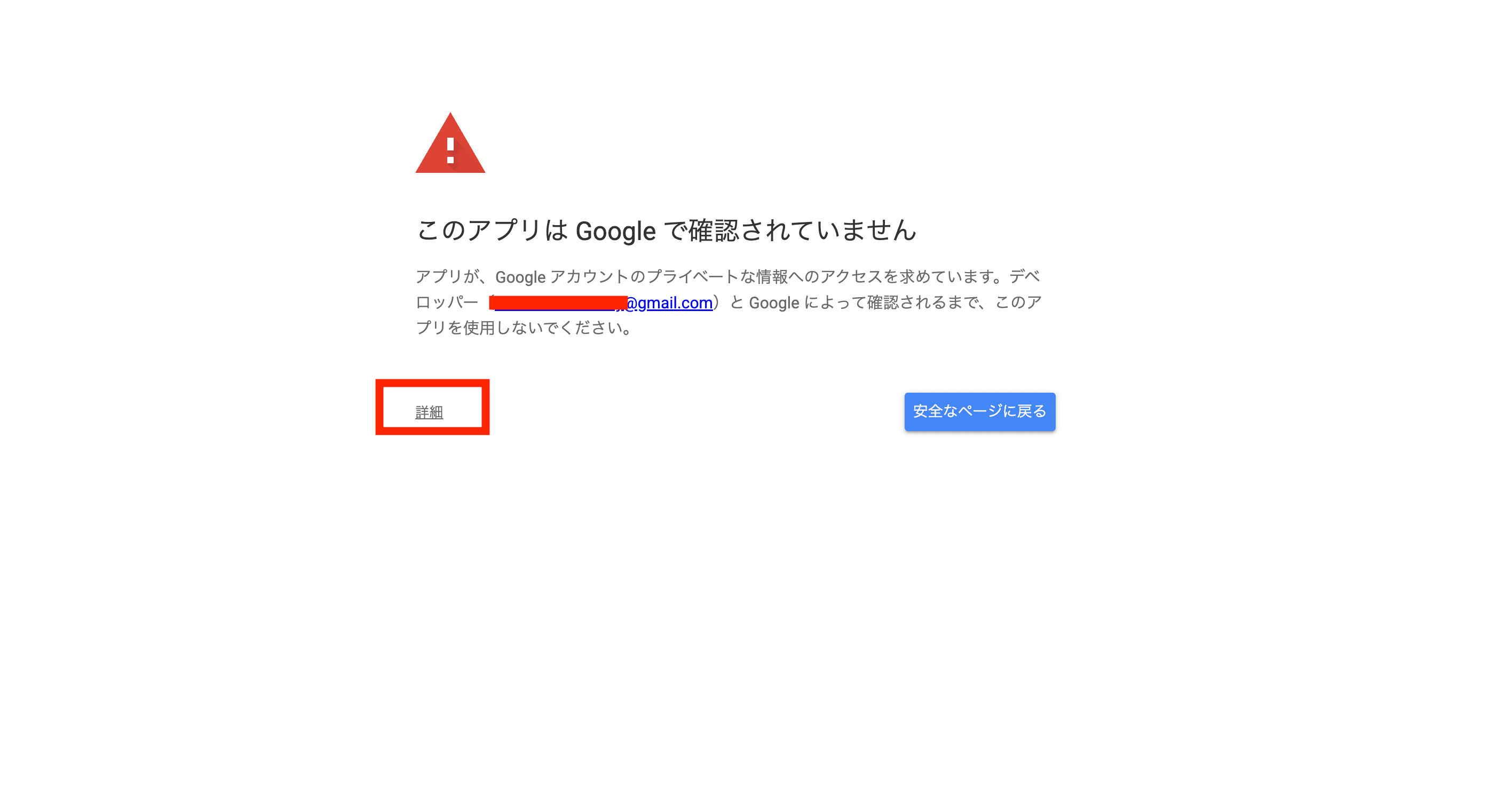 初めてGASを実行すると、Googleから「このアプリは確認されていません」という警告画面が表示されます。