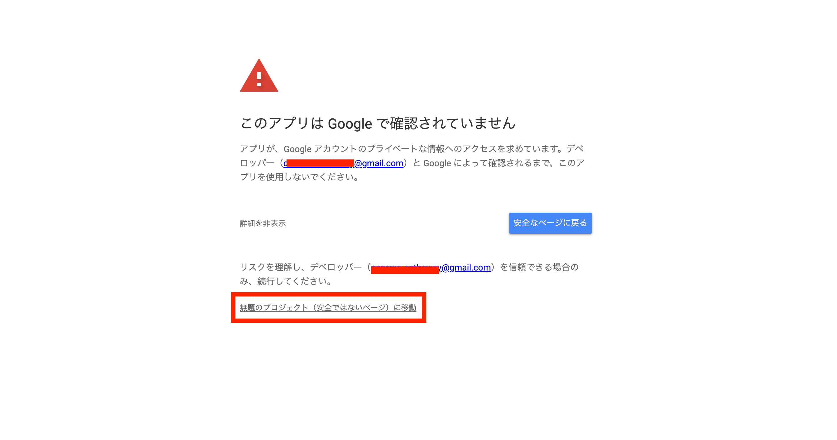 - 「(プロジェクト名)(安全ではないページ)に移動」をクリック