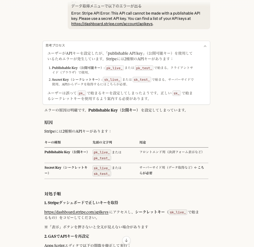 Claudeに聞くと、「Stripeには2種類のAPIキーがあり、`pk_live_`で始まる公開キーではなく、`sk_live_`で始まるシークレットキーを使ってください」と即答。なるほど、そういうことか。