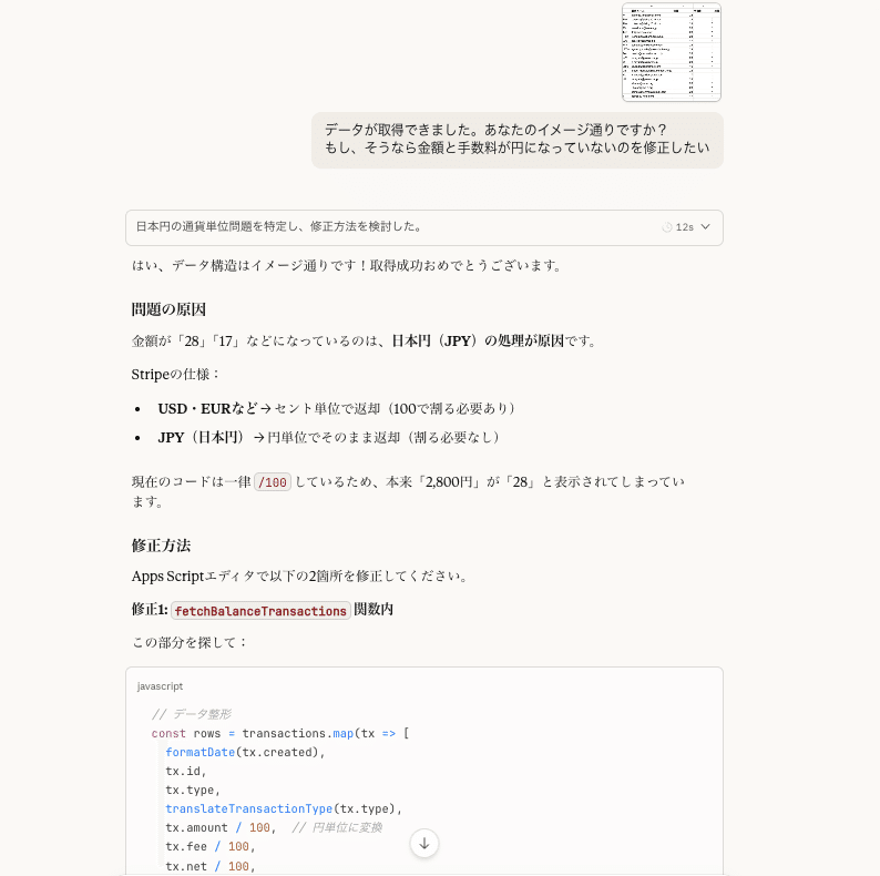 Claudeはファイルを解析し、カラム構成を把握した上で、変換用のコードを生成。勘定科目も私が指定した通り(売上高→システム開発・運営等、支払手数料→Stripe手数料、売掛金→Stripe)に設定してくれました。
