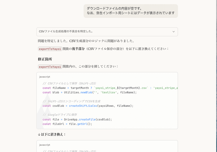 状況を伝えると、「CSV生成部分のロジックに問題がありました」と修正コードが返ってきた。