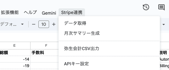 - 機能:Stripe取引データ取得、スプレッドシート連携、弥生会計CSV出力